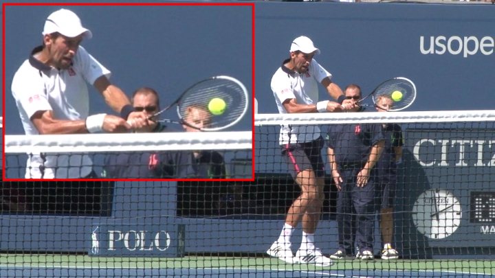 The seventh parameter for the return of serve is contact. The point of contact is based on the grip the player is using and the swing path and type of return being produced. Novak is taking this ball on the rise and driving the return so his point of contact is right at shoulder height.