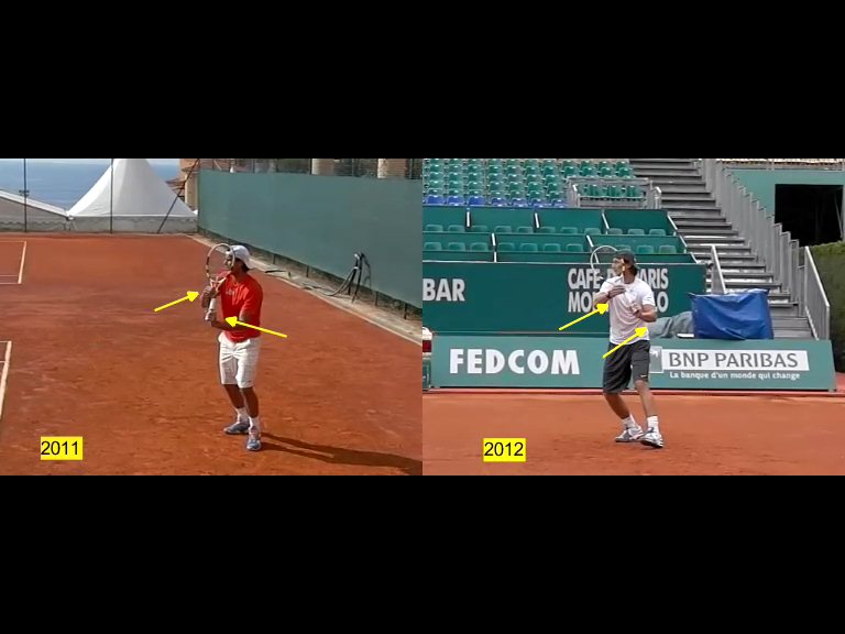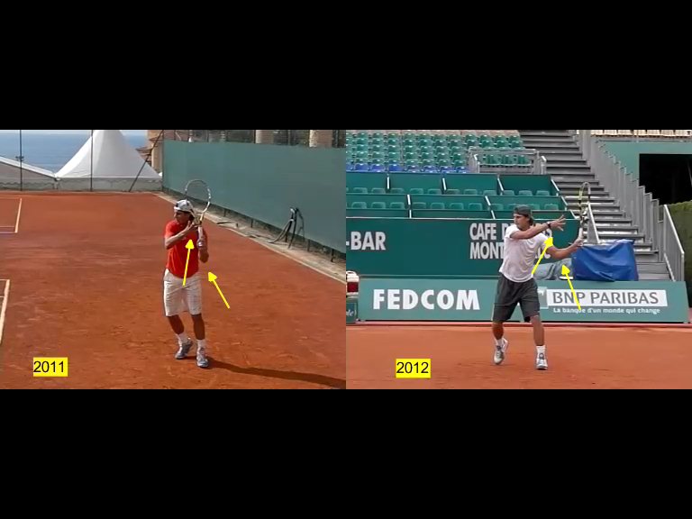 Analizzando i due diritti a confronto si nota come Nadal 2011 in partenza tratteneva la racchetta con la mano sinistra mentre la mano destra portava la racchetta dietro